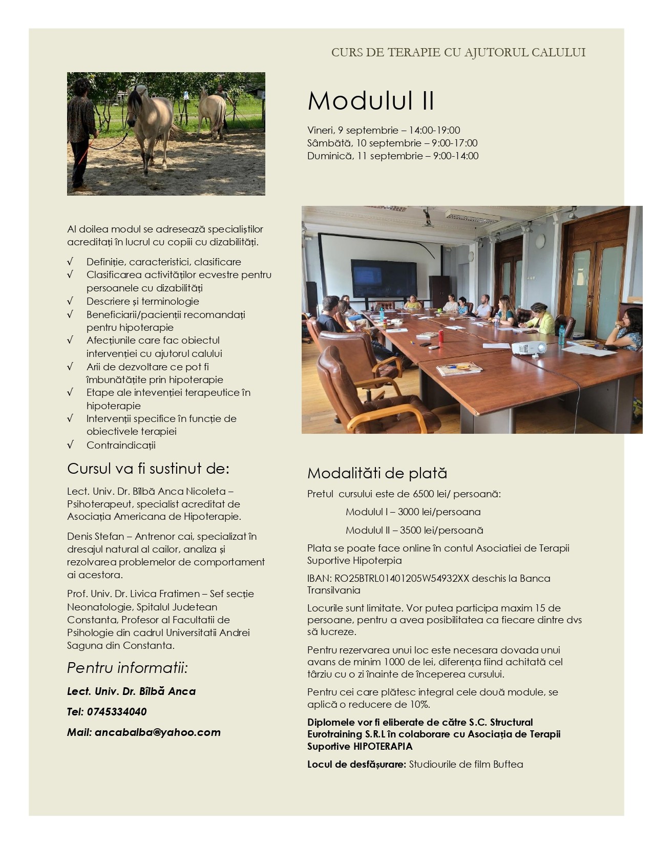Asociația de Terapii Suportive "Hipoterapia" revine și în acest an cu un curs specializat în Terapie cu Ajutorul Calului, oferind participanților oportunitatea de a învăța abilități avansate de gestionare a cailor de terapie și de intervenție terapeutică în lucrul cu copiii cu dizabilități. Descoperă cum această formă de terapie unică, bazată pe relația specială dintre om și cal, poate sprijini dezvoltarea fizică, emoțională și cognitivă a copiilor cu nevoi speciale. Prin intermediul acestui curs, vei obține cunoștințe și tehnici practice necesare pentru a oferi sprijin și îngrijire personalizată copiilor cu dizabilități, deschizând astfel noi perspective terapeutice într-un mediu sigur și stimulant.